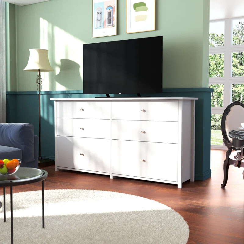 The Ebern Designs 6-Drawer Dresser from Wayfair was a perfect addition. While dressers are often reserved for bedrooms, I love incorporating them into living rooms for extra storage and display space. This sleek, modern piece fits right along one wall, offering plenty of room to store blankets, board games, and other living room essentials. Its clean lines and minimalist design blend seamlessly with the rest of the decor, giving the space a polished look without being overwhelming.